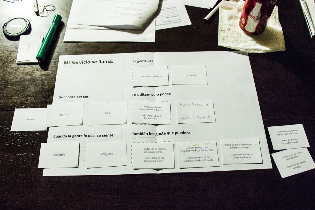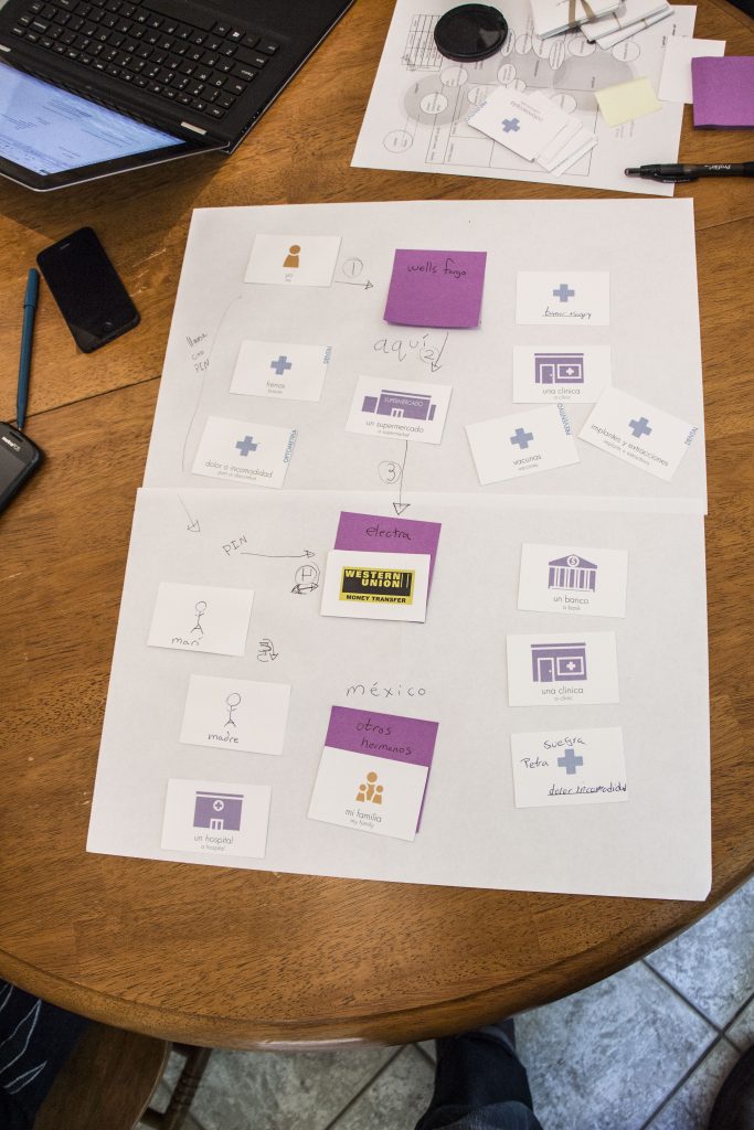 We then went on to a system-mapping exercise. In our first interview, for instance, our participant’s father had a heart attack (he survived) that landed him in the hospital with his distributed family footing the bill. We had our participants sort through cards representing hospitals, clinics, payment transfer services, and people and arrange them on an abstract US/Mexico (or El Salvador) map. As they constructed their maps, they told us the story in more detail about the flow of money and information (and gossip) in their families.
