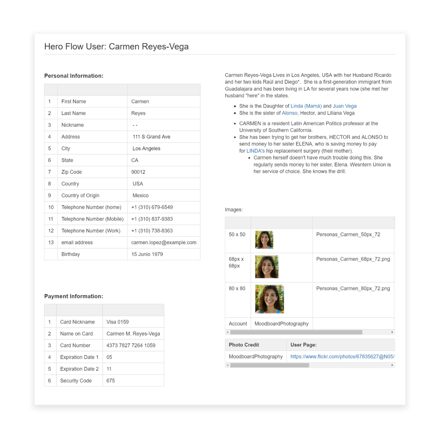 We build our personas around the family of Carmen Reyes Vega. Carmen lives in Los Angeles, California, and has family – her parents, sister, and nephew – in San Salvador.* She also has two brothers that live in the US – Hector who doesn’t make a whole lot and doesn’t really have a bank account, and Alonso, who has done quite well for himself in his career.